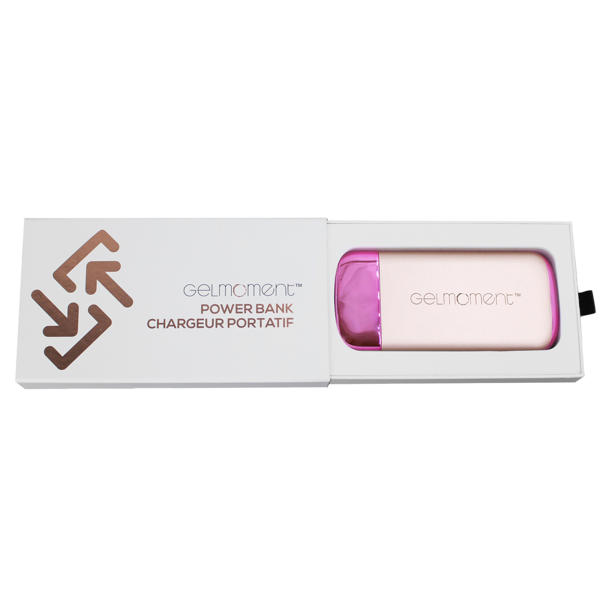 Available with either pink or gold accents, this GelMoment branded Power Bank will be an eye-catching conversation starter wherever you go. Perfectly sized to fit into your Beauty Bag, purse, or the pocket of your favourite jeans, this Power Bank packs a punch!